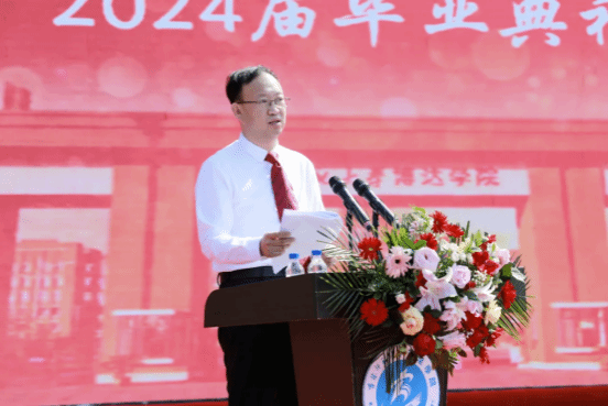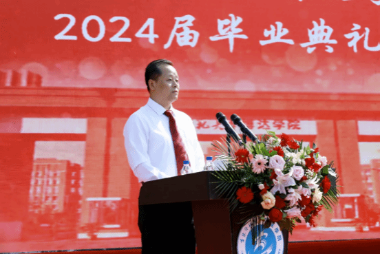 执行校长王国军向全体毕业生顺利完成学业表示热烈地祝贺!同时送上了四句临别赠言:一是要勤奋。希望同学们意识到用勤奋成就人生是一条成功率最高的道路,每一滴汗水,每一份努力,都是在为未来铺路,在最美好的年华,最应该奋斗的时候,一定要把握时机,全力以赴,不负韶华。二是长才能。社会本身就是一所没有围栏的学校,还是一所与时俱进的学校,它没有固定的教室和教材。在今后的岁月里,希望同学们不以山海为远,不以日月为限,不断地增长才干,让自己熠熠生辉。三是肯担当。希望同学们都能扛起自己人生的责任,家庭的责任,社会的责任,敢为人先,超越自我,遇风雨,便风雨兼程,遇荆棘,便披荆斩棘,越是艰险越向前,做生命的强者,做时代的弄潮儿。四是能豁达。希望同学们要在拿起和放下之间修炼自己,在奋力追求成功之外,须有一些豁达淡然的气度,以勤奋入世,以淡泊出世。积极、坦然的面对生活中的波澜,走到更广阔的的天地,看更美的风景。
