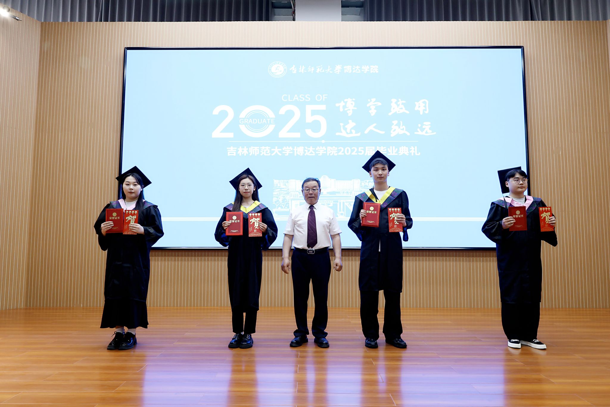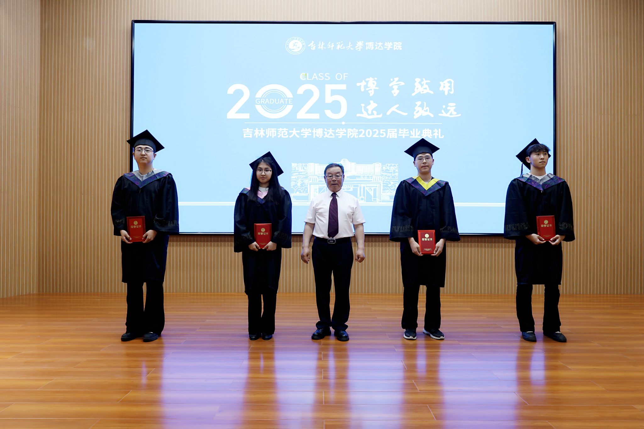 校长张勇为2025届优秀毕业生代表李强、李一多、于光、张译文颁发证书。