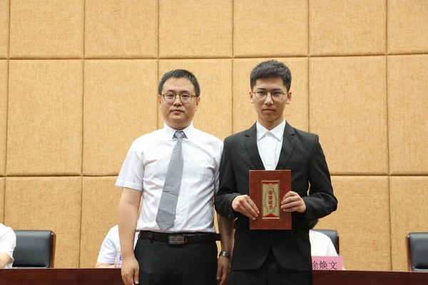 (徐春喜副院长为2019届考取研究生代表肖志强同学宣读了研究生录取通知书并颁发奖学金)