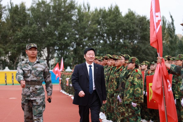常务副院长王国军在军训团团长的陪同下检阅各方队,并向军训学生致以亲切的问候。