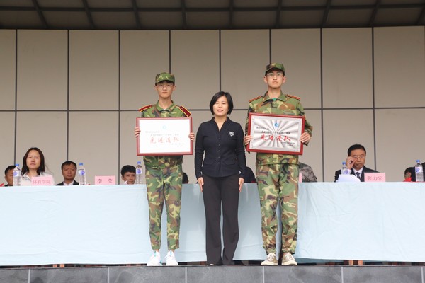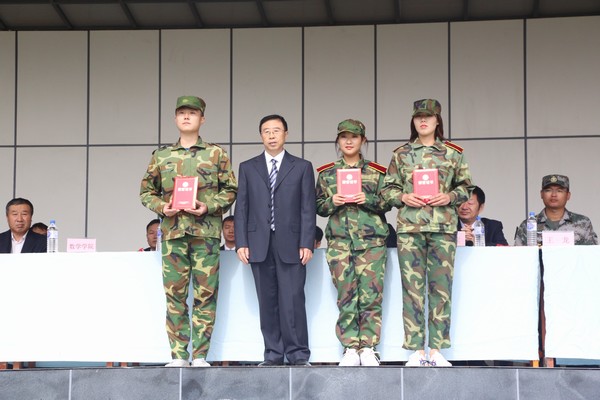 学生处处长张宏源宣布军训综合评比成绩。与会领导为获奖集体和个人颁发了荣誉证书。军训评选出8支“先进连队”,263名“军训标兵”,44个“内务先进寝室”。王国军向部队赠送锦旗。
