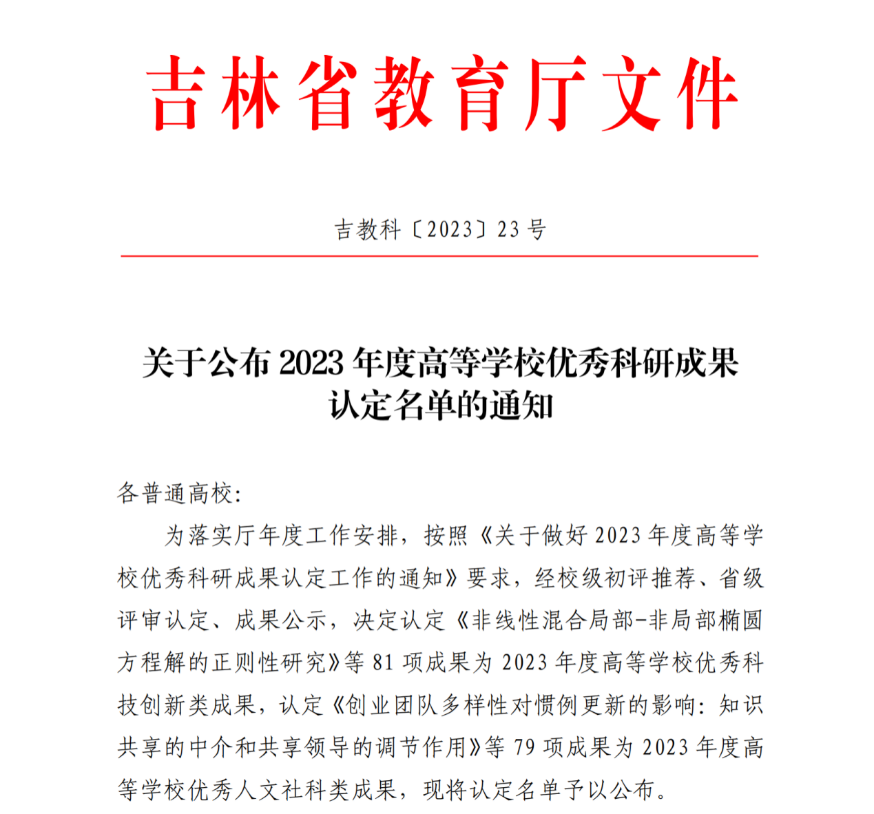 喜报:我校1项成果被认定为2023年度高等学校优秀科研成果