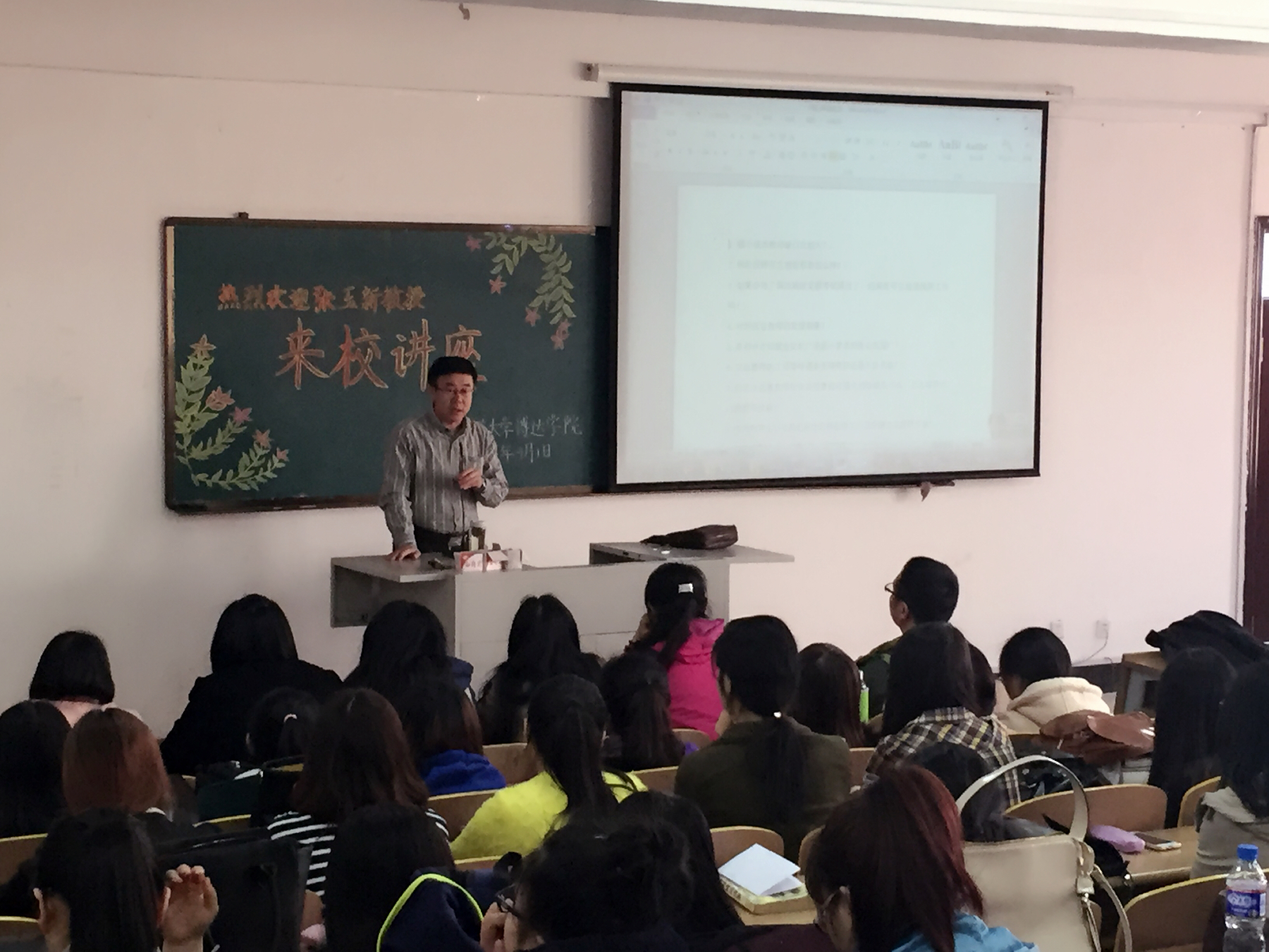 中文师范生应具备什么样的知识和技能?张教授首先就中文系学生关注的热点问题进行了耐心解答,接着阐释了中文系师范生应具备的知识素养:完整的专业知识结构、专业特长以及丰富的相关学科知识。规范美观的板书、声情并茂的朗读、富于渲染性的即兴演讲是中文师范生应具备的技能。张教授指出,师范生作为教师的预备者,务必要从内功、外功两个方面加以修炼,用建构主义和“滚雪球效应”的思维不断积累和超越自己。张教授选取了《水浒传》中的部分章节进行了现场示范,同时分享了张教授本人现在所读的“杜诗三首”所涉及的书目。张教授平易近人的讲座拉近了与师生的情感距离,其广博精深的学识和诙谐幽默的风格深深感染了在座的师生,对中文系的“准教师们”未来的职业生涯具有深远的影响。