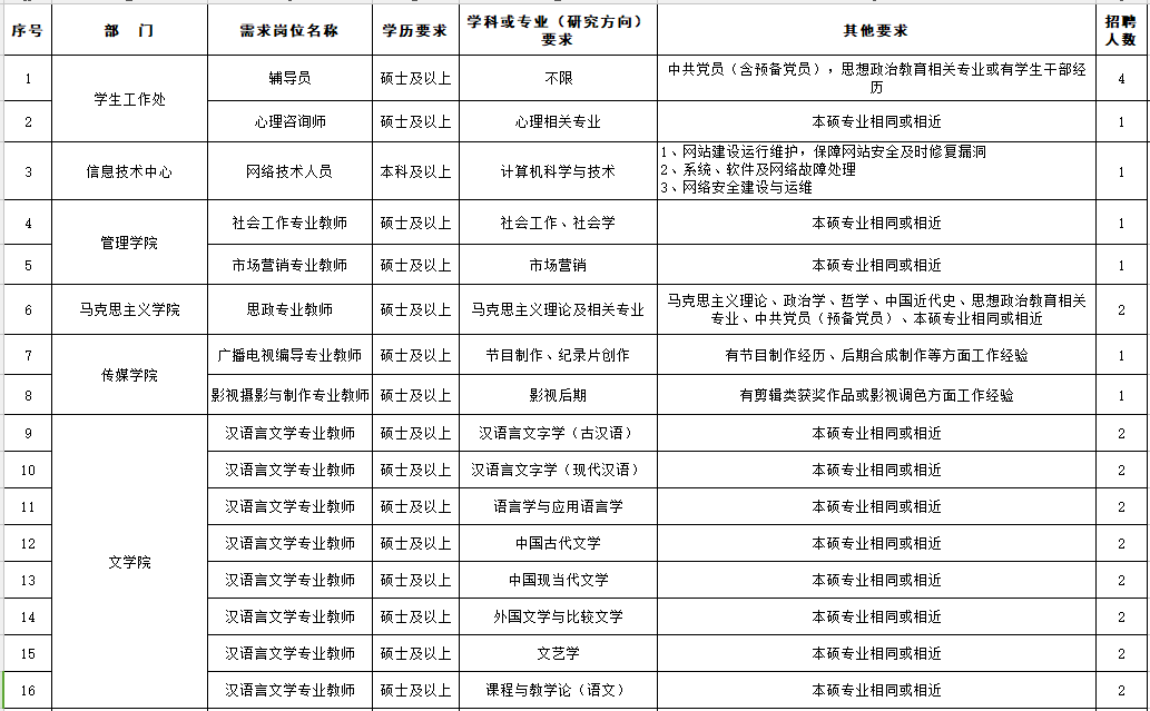 2.学校招聘工作统一由学院人事处负责组织实施,所有招聘信息均会通过我学校官网、官微发布,且不会以任何名义收取费用。对于学校未对外公开发布的招聘信息请求职者注意甄别、核实,勿轻信其他途径的虚假信息而上当受骗。