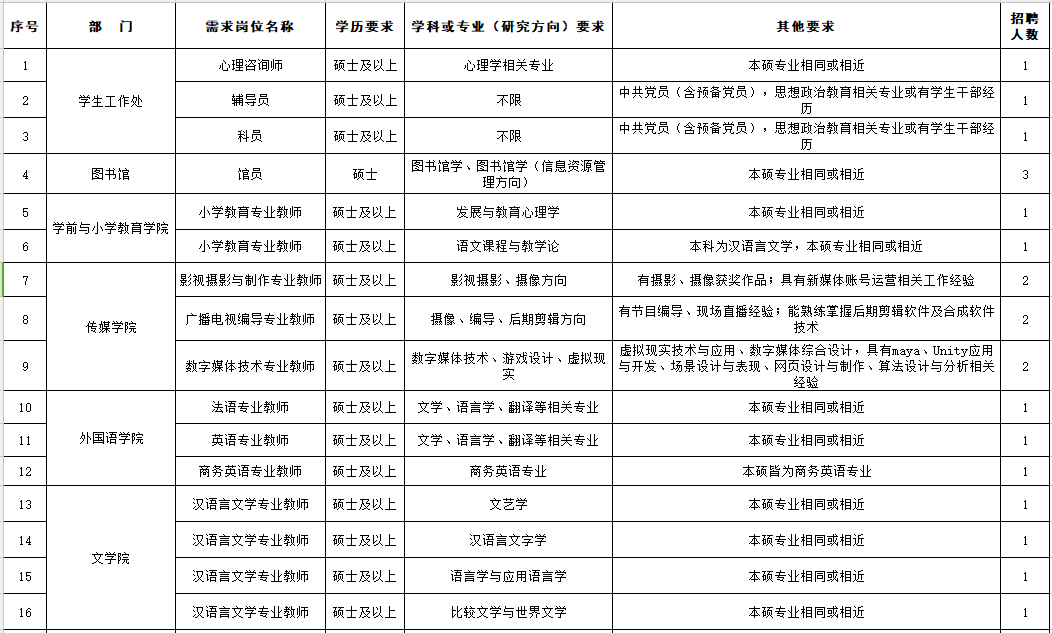 2.学校招聘工作统一由学院人事处负责组织实施,所有招聘信息均会通过我学校官网、官微发布,且不会以任何名义收取费用。对于学校未对外公开发布的招聘信息请求职者注意甄别、核实,勿轻信其他途径的虚假信息而上当受骗。