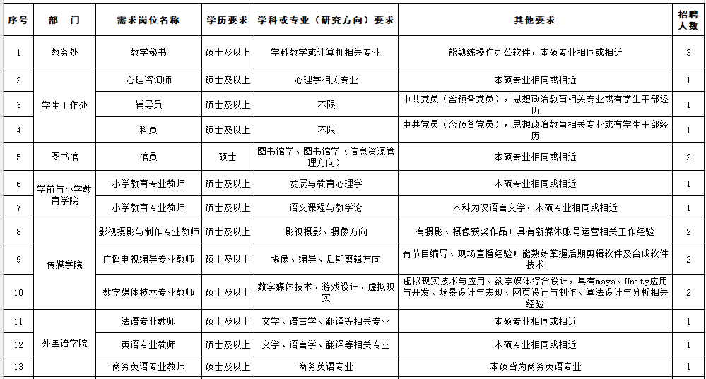 2.学校招聘工作统一由学院人事处负责组织实施,所有招聘信息均会通过我学校官网、官微发布,且不会以任何名义收取费用。对于学校未对外公开发布的招聘信息请求职者注意甄别、核实,勿轻信其他途径的虚假信息而上当受骗。