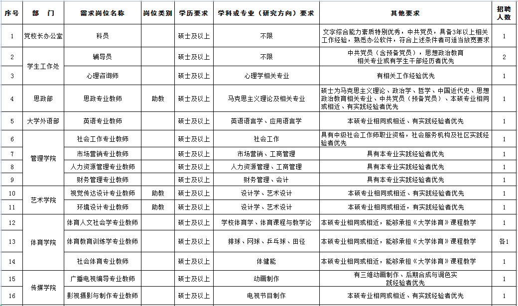 2.学校招聘工作统一由学院人事处负责组织实施,所有招聘信息均会通过我学校官网、官微发布,且不会以任何名义收取费用。对于学校未对外公开发布的招聘信息请求职者注意甄别、核实,勿轻信其他途径的虚假信息而上当受骗。