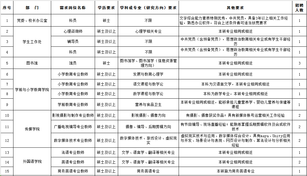 2.学校招聘工作统一由学院人事处负责组织实施,所有招聘信息均会通过我学校官网、官微发布,且不会以任何名义收取费用。对于学校未对外公开发布的招聘信息请求职者注意甄别、核实,勿轻信其他途径的虚假信息而上当受骗。