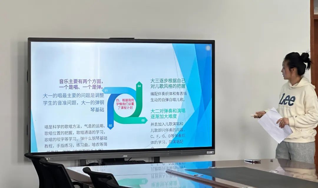 会议伊始,龚健美老师带来了《学前学生专业赛事与专业课程教学的深度融合策略研究》的分享。她深入剖析了学前教育的专业性质,明确了学前教育专业音乐实践课程的培养目标,并进行了详细的学情分析。同时,龚老师还指出在基于学情的声乐教学中应注意的问题,提出了根据学情精心设置课程计划的思路,强调了专业赛事与专业课程深度融合的重要意义。