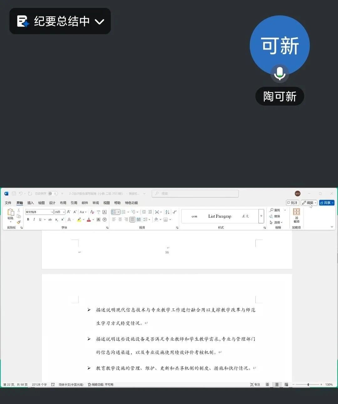 随后会议由专业负责人陶可新和张东月老师就认证材料的准备工作进行补充说明,表示将提供相关学习材料供教师参考,以统一行文逻辑;以及描述说明了现代信息技术与专业教学工作进行融合用以支撑教学改革与师范生学习方式转变的情况。
