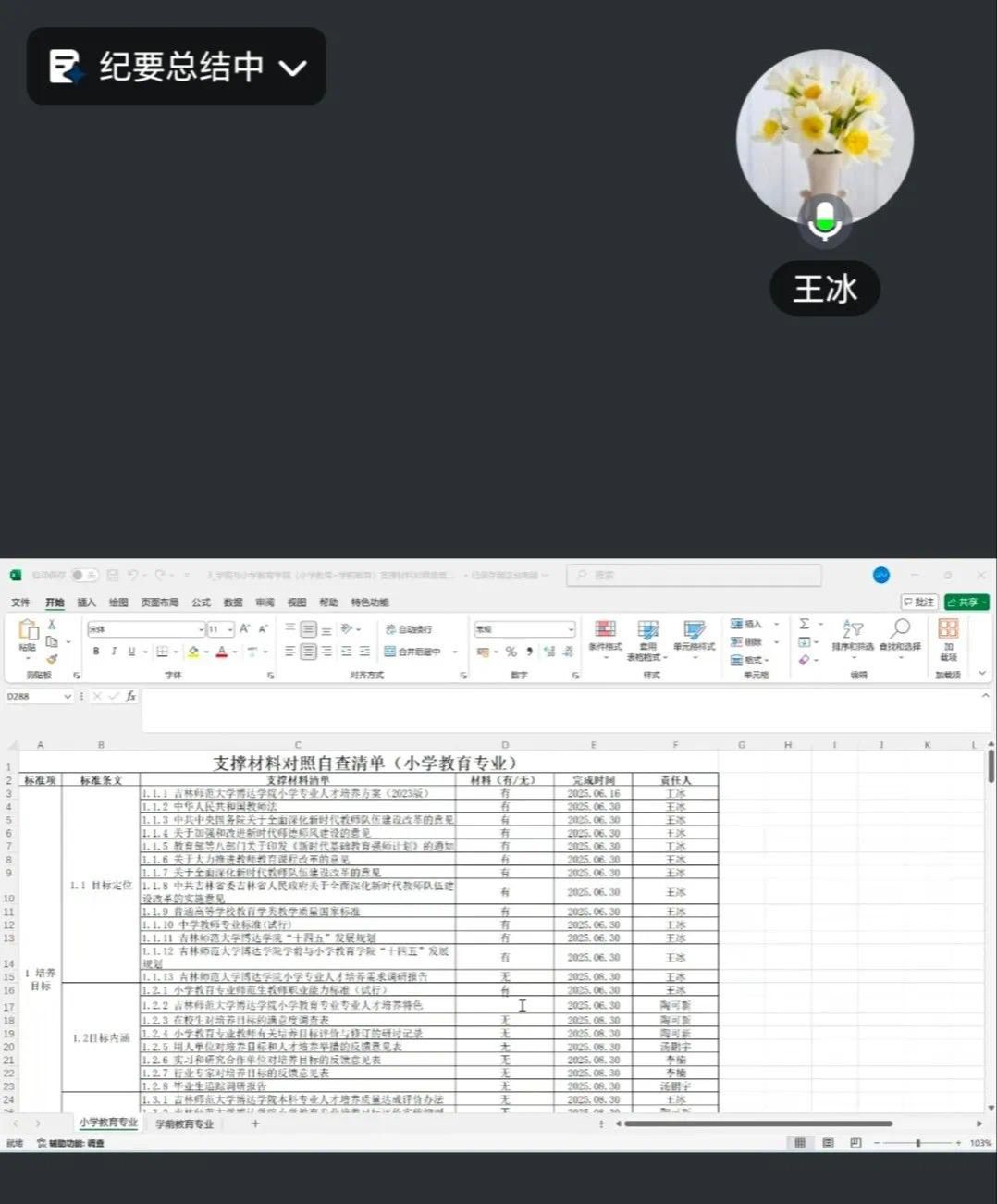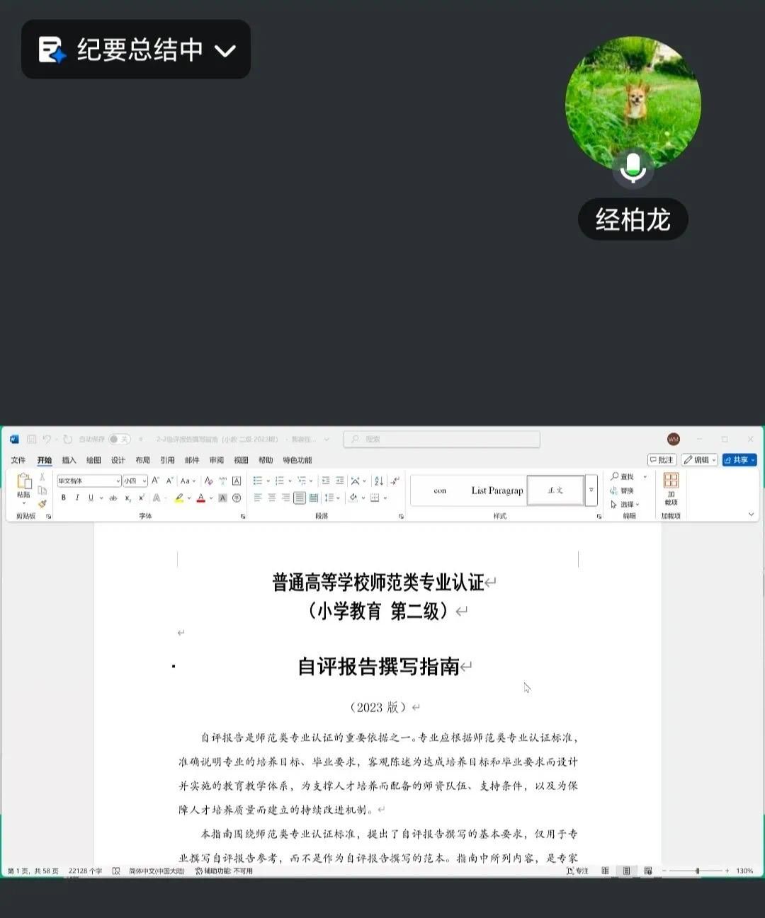 为全面推进师范专业认证工作,学前与小学教育学院于2025年7月24日下午19:00通过腾讯会议召开了第五次师范专业认证线上会议。会议围绕师范专业认证相关材料进展展开,重点讨论自评报告撰写工作。本次会议参会人员有学前与小学教育学院经柏龙院长、王冰副院长及学院全体教职工,由王冰副院长主讲。