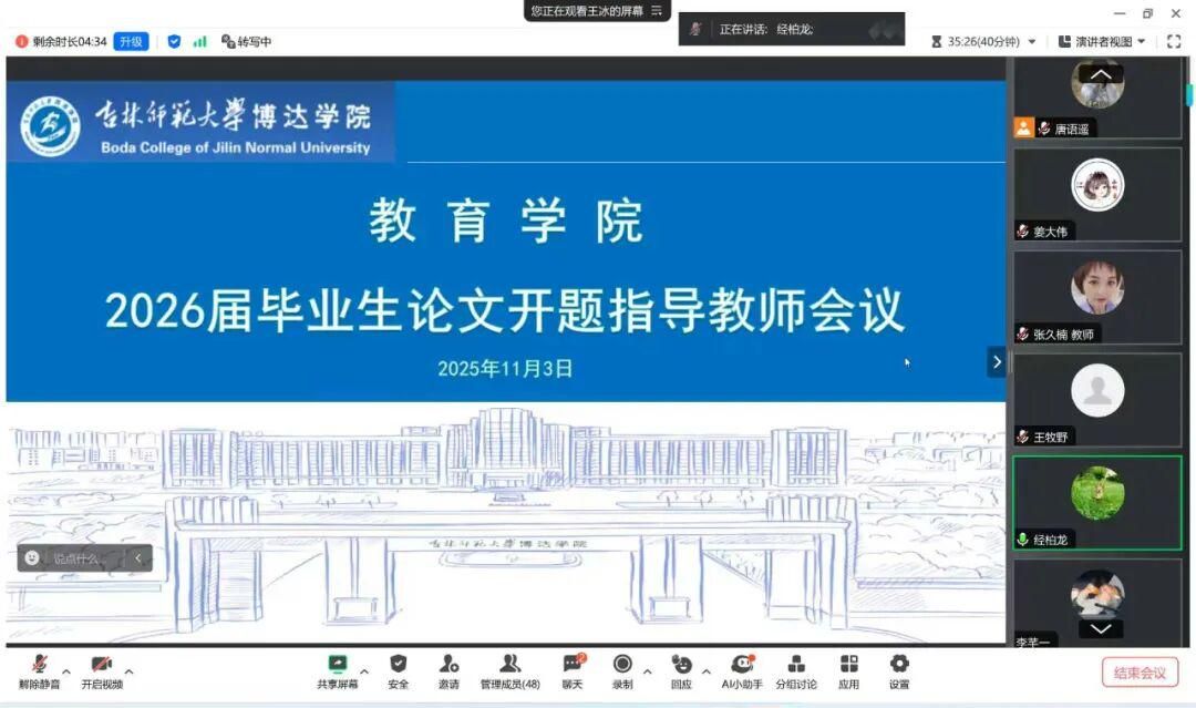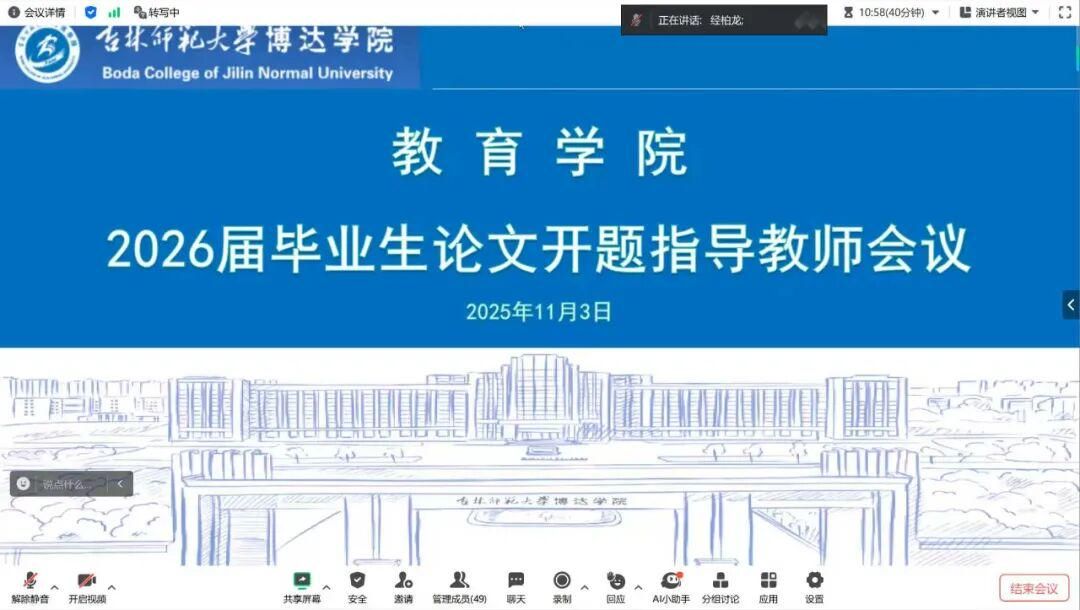为有序推进毕业生论文开题工作,进一步明确指导教师的职责与任务,教育学院于2025年11月3日晚19:00通过腾讯会议线上召开了2026届毕业生论文开题指导教师会议。教育学院经柏龙院长、王冰副院长及全体2026届毕业论文指导教师参加了本次会议。