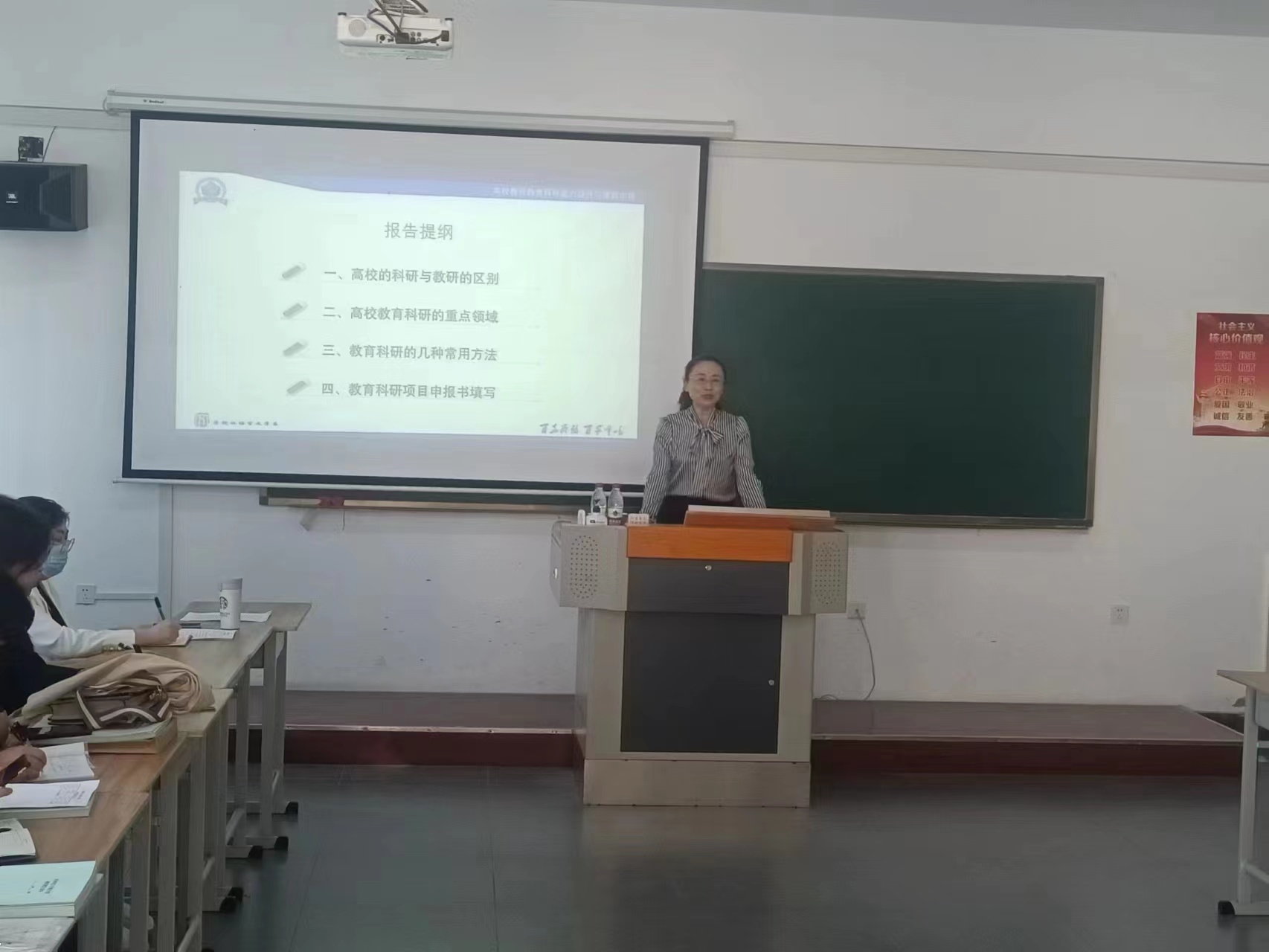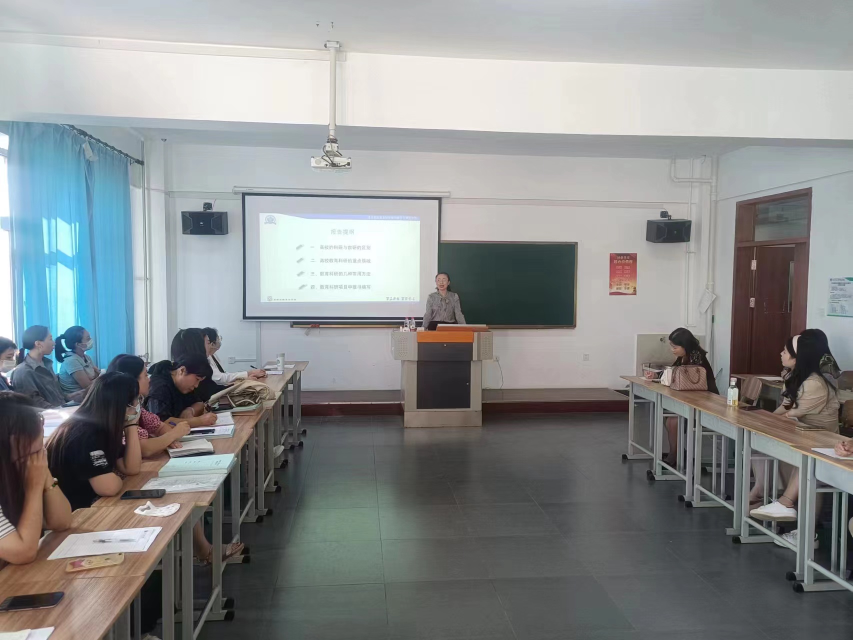 讲座开始,孙艳红教授提出教育科研是高校教师必备的能力之一,也是高师院校教师专业发展的增长点,并厘清了高校教研与科研的区别,提出高校教师应围绕课程思政、职业生涯、大学生实践等重点领域展开教研。随后,孙艳红教授提到教师参加科研的根本目的:是为了通过科研指导和促进教育教学改革,更好地贯彻党和国家的教育方针,提高教师的教育水平和开拓进取的创造精神。孙艳红教授还介绍了高校科研的常用方法,帮助教师们科学高效的进行科研。最后,孙艳红教授针对教师科研中出现的问题给出了具体的建议,规范了申报书的填写,使教学目标的确立、教学内容的选择、教学结构的设计等符合科学性的要求,使教师在科研和教研方面有了更清晰的认识。