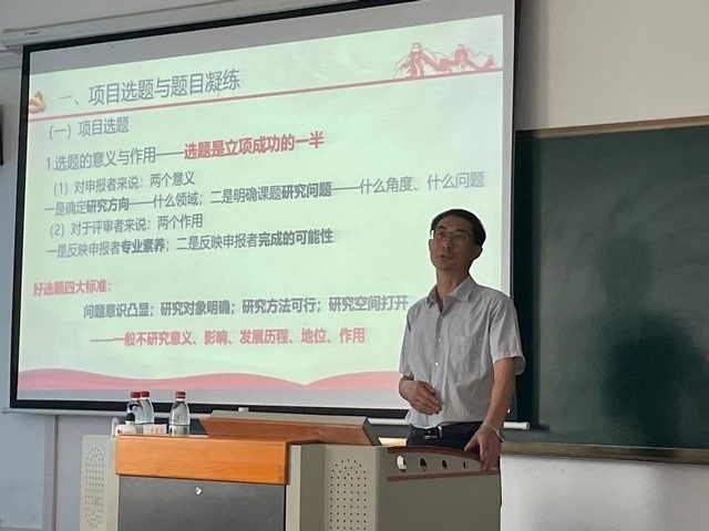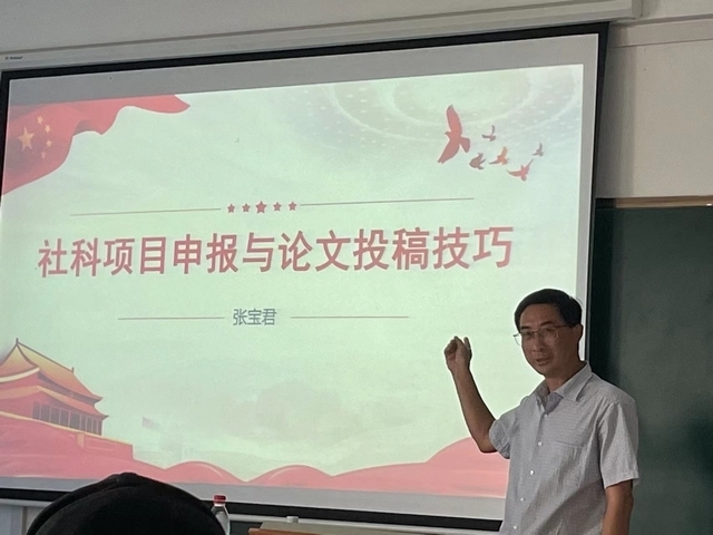 讲座中,张宝君教授分别从项目选题与题目凝练,选题依据、研究内容设计、研究思路与方法和项目转化成果五个方面讲解了有关社科项目申报与论文投稿技巧的知识。