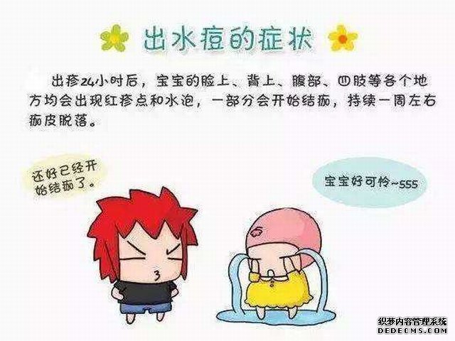 ③出疹24小时后,面部、背部、腹部、四肢均出现红疹点和水泡。
