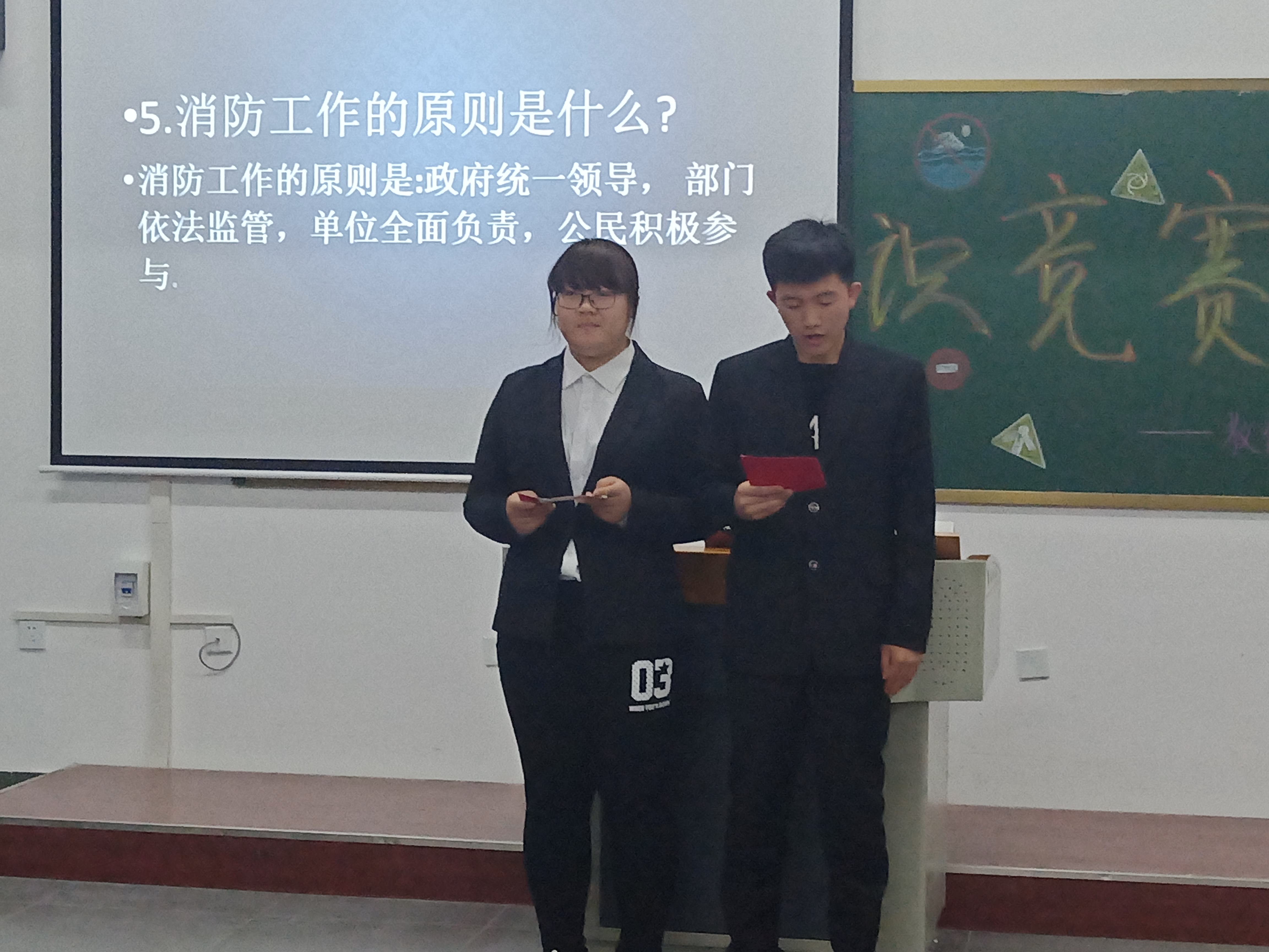 此次活动先进行的是团体赛,两个班级选出的四名选手进行填空题和简答题的抢答,并且在这个阶段中从两班各选出一名优秀的选手进行接下来的1V1比赛。在1V1的比赛中,两名选手反应迅速,竞相展现丰富的安全知识,正确率极高,难分伯仲。在紧张的比赛之余,两名同学为我们带来了《小酒窝》,两位同学优美的歌声使比赛中紧张的气氛得到了一定的缓和。之后又进行了3V3比赛,双方同学精心准备积极参与,在激烈的竞争中比赛结束,三班最终获得了胜利。