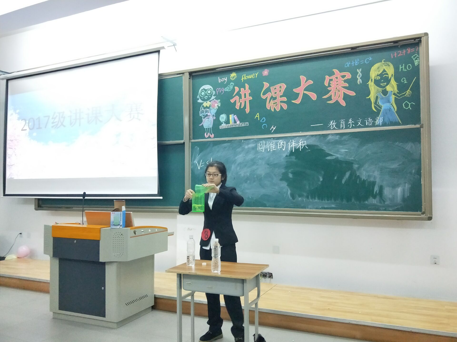 八位经过层层选拔脱颖而出的决赛选手,积极领会比赛精神和规则,认真负责地准备比赛。比赛中,参赛选手们的讲授重点突出、生动形象,他们或幽默,或稳重,或严谨,结合教具或课件,展现出了我系学子扎实的专业功底,为大家带来了一场视听盛宴,赢得台下观众的阵阵喝彩。其中八号选手为大家带来的《圆锥的体积》一课,通过旧知回顾,导入新知,深入浅出,讲练结合。并运用现场实验的办法,通过注水证明,等底等高的圆锥的体积是圆柱的三倍,进而推导圆锥的公式。逻辑清晰,生动形象,易于理解。该位选手标准的普通话,淡定的气场,流利的板书,与学生较强的互动性,给在场的评委和观众留下了深刻的印象。比赛后,常海涛老师对此次比赛做出点评,希望大家今后都能针对自己的不足之处多加练习,进一步加强对教材、对课程的理解把握,强化教学基本功,练就过硬本领,为未来站上三尺讲台做好准备。在此次比赛中获得一等奖的有姜畅;获得二等奖的有李婉姝、王昱权、田景怡;获得三等奖的有李晓双、陈雪、闫安、马俊伟。