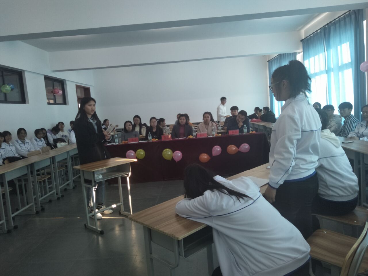 此次活动在同学们极富感染力的朗诵《青春的诗》中拉开序幕。在班会召开的过程中,同学们的才艺表演不禁让人眼前一亮。风趣幽默的小品、相声,让同学们在欢乐中畅谈梦想,一段段令人激情澎湃的朗诵,让同学们身临其境领悟学风的重要性,还有别出心裁的三句半、手势舞,在有效的促进学生学习的积极性的同时培养了学生良好的学习习惯。最后本次学风建设主题班会在娓娓动听的弹唱声中落下帷幕。