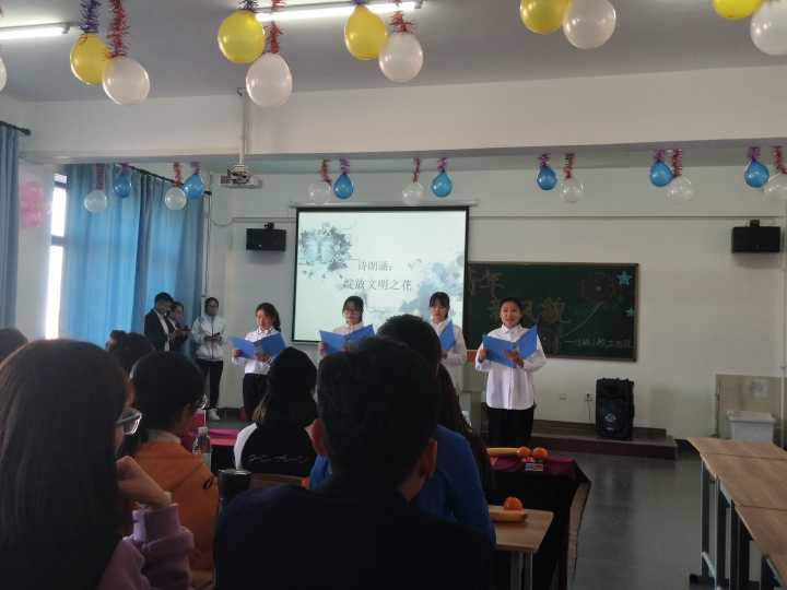 活动伊始,由两位同学带来的开场舞《最美的期待》,婀娜且坚定的舞姿充分体现了当代青年对未来的美好期待。班会召开过程中,一段段激情澎湃的诗朗诵,一个个幽默风趣的小品,一首首悦耳动听的歌曲,还有那别具特色的快板《走进新校园》,都让同学们身临其境地感受到了文明树新风的重要性,同时在这欢乐气氛中充分领悟民族之礼仪,时代之文明。最后,伴随着歌曲《追光者》那优美动听的旋律,本次学风建设主题班会圆满落下帷幕。