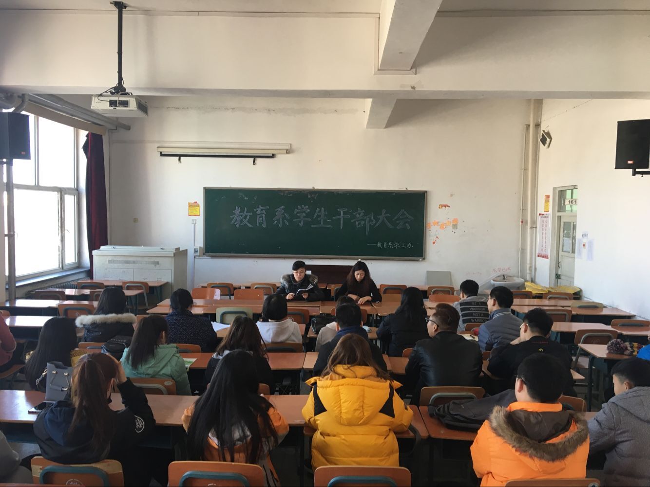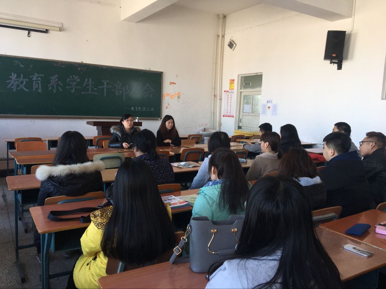 2017年3月1日下午2点,教育系在1615教室召开了本学期期初学生干部大会,学工办主任侯雨忻老师、辅导员宋佳老师及14级全体学生干部参加了此次会议。