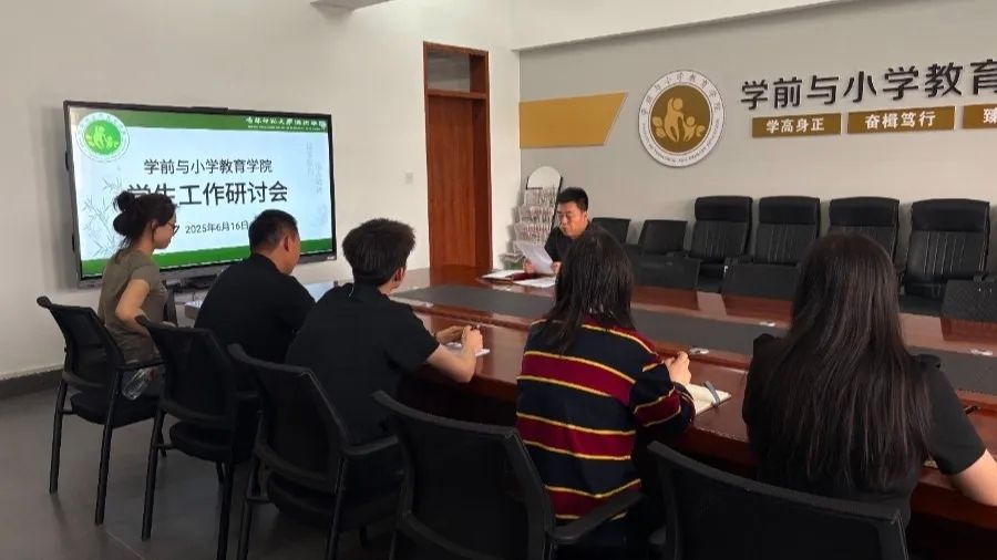 为进一步明确学生工作方向,细化任务分工,推动学前与小学教育学院学生工作高质量发展,学前与小学教育学院于2025年6月16日在综合楼1309会议室召开六月学生工作研讨会。本次会议由学前与小学教育学院学工办主任汤鹏宇老师主讲,全体辅导员参与会议,共同探讨学习。