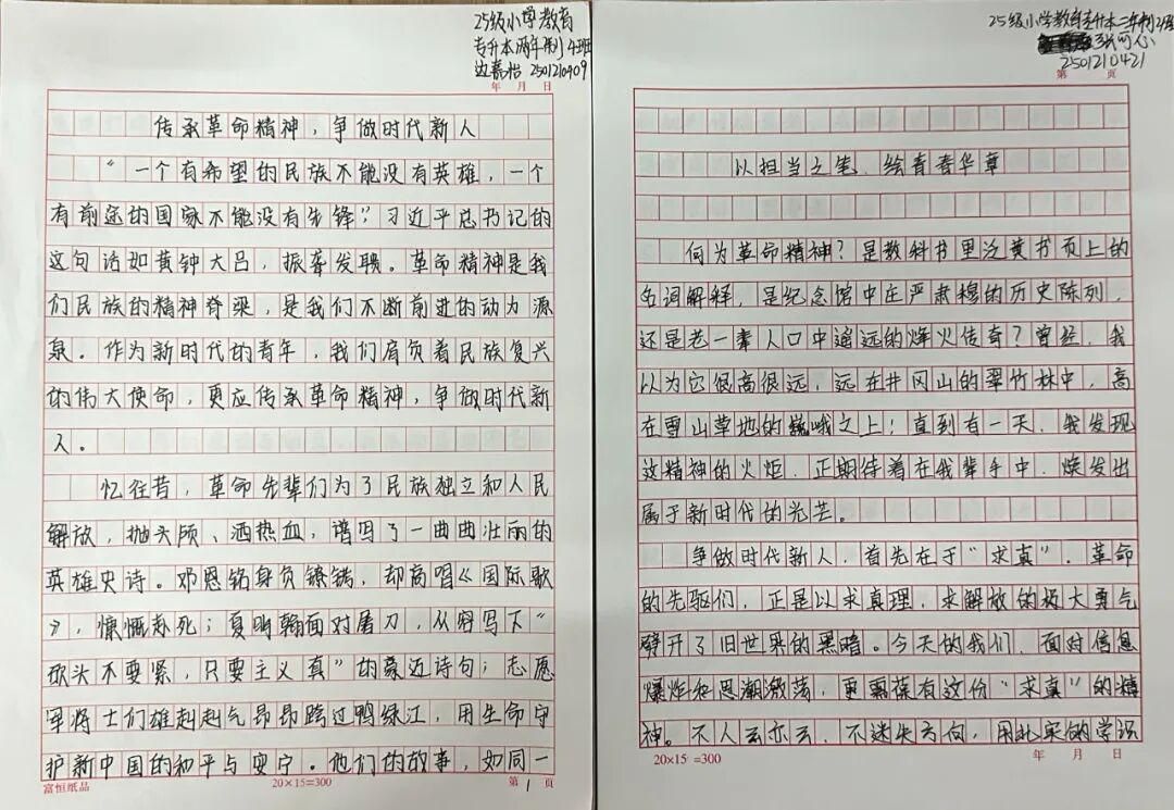 翻开沉甸甸的手写征文,字里行间满是赤子真挚。以“传承革命精神,争做时代新人”为题,在字斟句酌的标准汉语里,诉说着青年一代对使命担当的深刻思考。每一篇都是对革命历史的深情回望,每一笔都是对精神血脉的坚定传承。