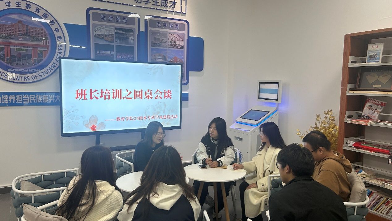 教育学院于10月14日15:00在图书馆一站式事务服务中心召开24级本专班长培训之圆桌会谈——学风建设,本次活动由24级本专科辅导员高馨老师主持,全体24级本专科班长参加。