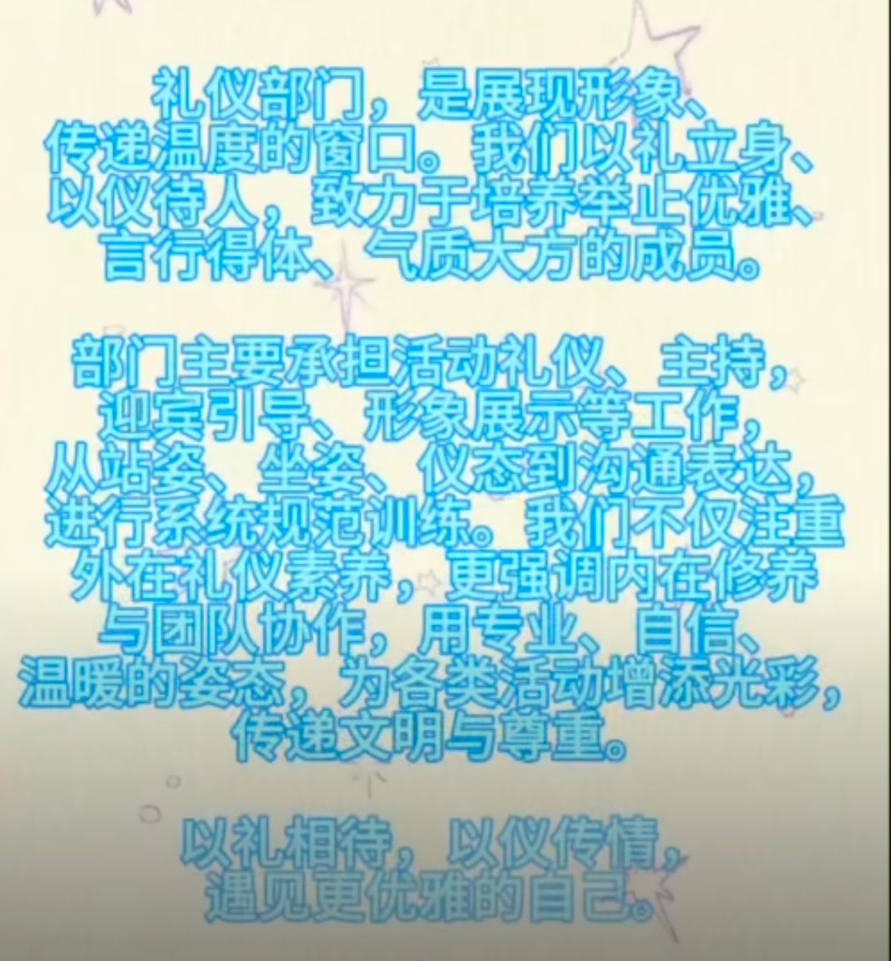 工作内容:1.主要承担学院活动礼仪、主持、迎宾引导、形象展示等工作,从站姿、坐姿、仪态到沟通表达,进行系统规范训练;2.我们不仅注重外在礼仪素养,更强调内在修养与团队协作,用专业、自信、温暖的姿态,为各类活动增添光彩,传递文明与尊重。以礼相待,以仪传情,遇见更优雅的自己。
