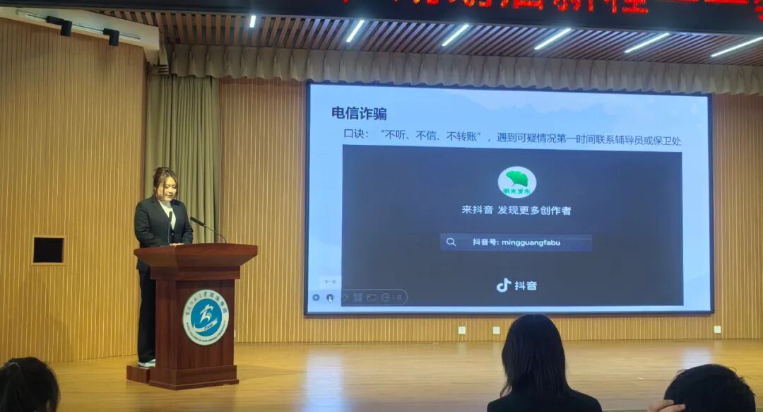 接着,开展“安全必修课”专题教育。围绕电信诈骗防范、传染病预防、寝室安全及心理健康四大主题,结合真实案例敲响安全警钟,提醒同学们既要警惕网络诈骗、守护人身安全,也要关注情绪状态,及时寻求心理支持,为成长之路筑牢安全屏障。