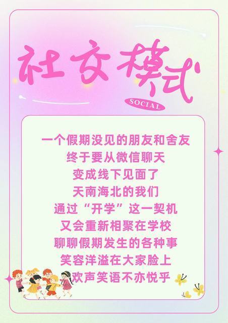 社交模式:新学期是拓展社交圈、结识新朋友的好时机。让我们积极开启多元社交模式,拥抱多彩校园生活;让我们以开放的心态,去拥抱每一个相遇,收获珍贵的友谊,共同书写属于我们的青春故事。