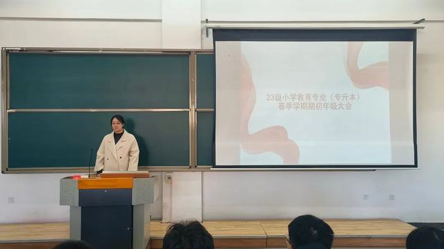为了提升学生的学习积极性与班级凝聚力,为学生们的未来职业规划提供指导,学前与小学教育学院于2024年3月13日14:00在综合楼1118教室召开了23级小学教育专业(专升本)春季学期期初年级大会。本次大会由23级小学教育专业(专升本)辅导员王一波老师主讲,23级小学教育专业(专升本)全体学生参加。