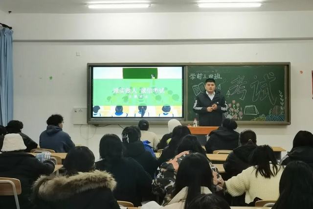 考试,是对阶段学习的总结和检验。在期末考试和英语四六级考试到来之际,为打造学前与小学教育学院良好学风,营造公平公正、诚实守信的考试氛围,学前与小学教育学院23级本专科辅导员郑越洋老师组织23级本专科各班同学开展诚信考试主题班会。