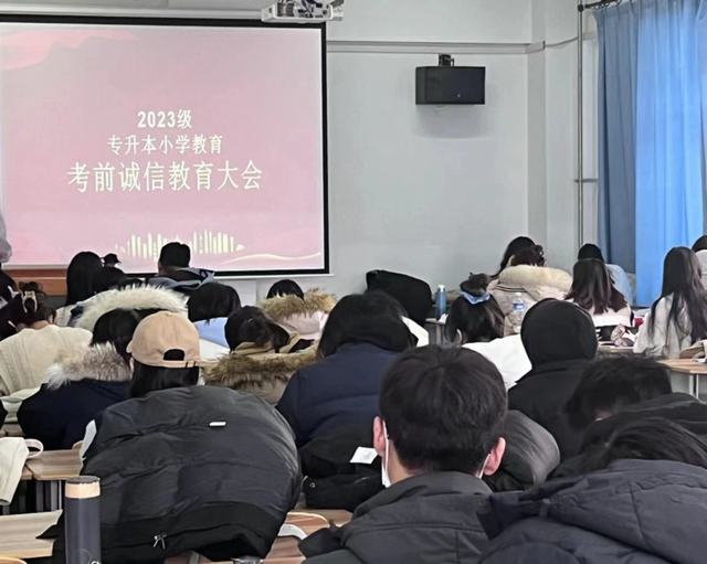 为了增强学前与小学教育学院学生诚信考试意识,营造诚实守信的优良考风,学前与小学教育学院22级专升本辅导员高馨老师和23级专升本辅导员王一波老师于2023年12月15日在综合楼分别召开了学生诚信考试教育大会。
