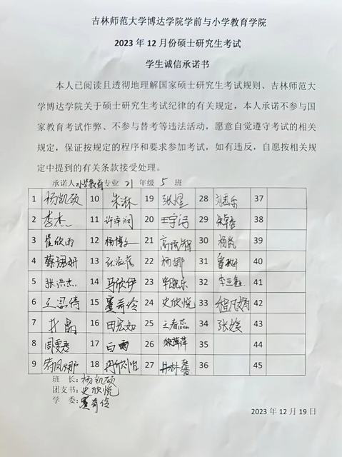 星辰流转、岁月更迭,又是一年考研时。为树道德之新风,立诚信之根本,营造公平公正的考试环境,学前与小学教育学院组织开展了“2023 年12月份硕士研究生考试学生诚信承诺书”签署大会。