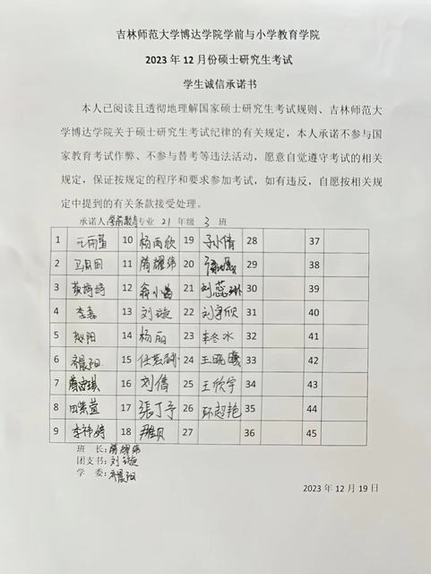 我院学生认真阅读且透彻理解了国家硕士研究生考试规则、吉林师范大学博达学院关于硕士研究生考试纪律的有关规定,签署后,同学们纷纷承诺不参与国家教育考试作弊、不参与替考等违法活动,并自觉遵守考试的相关规定,保证按规定的程序和要求参加考试,如有违反,自愿按相关规定中提到的有关条款接受处理。