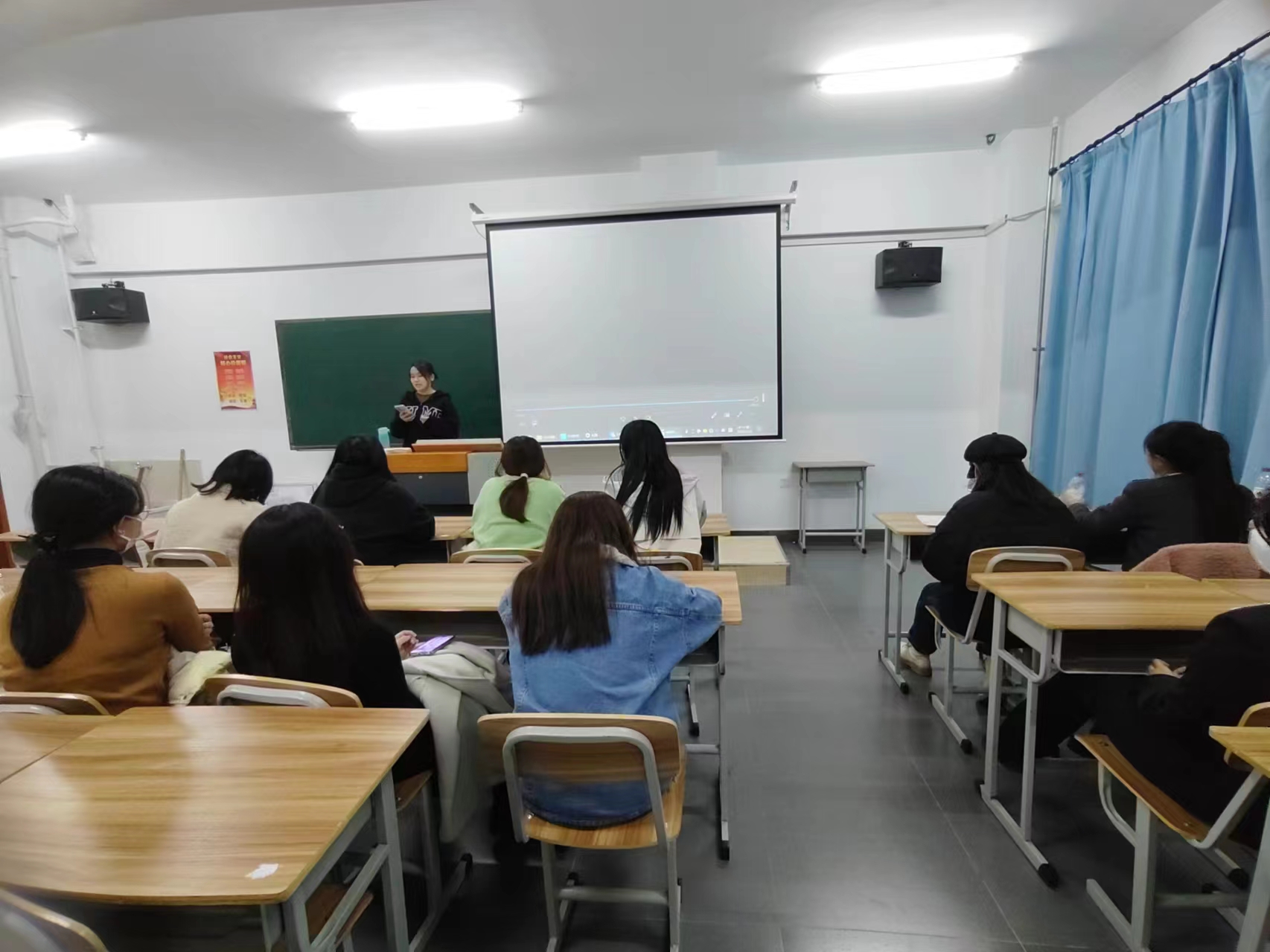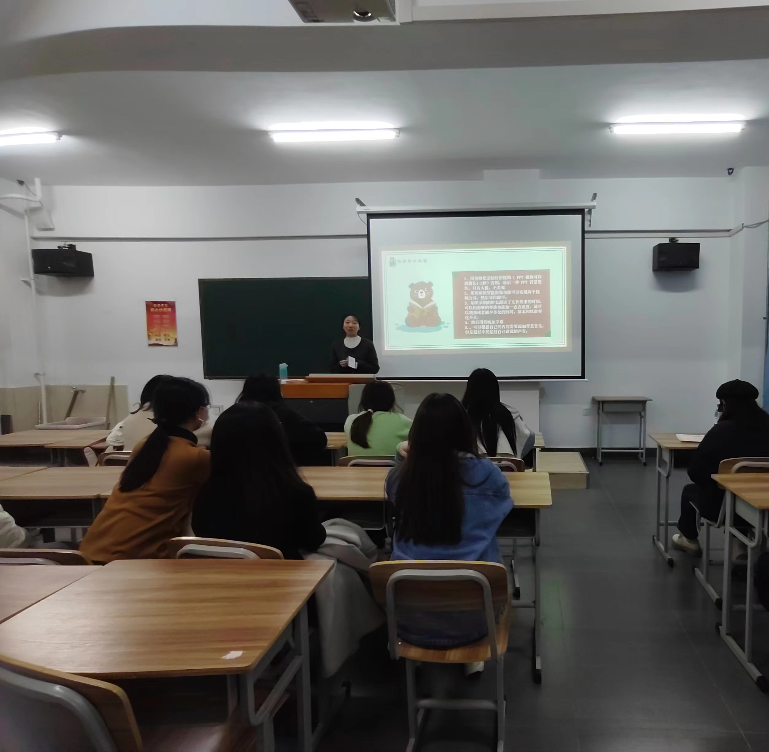 随后,赵悦含同学提到两点,第一,微课大赛的片头都是统一要求的;第二,在拍摄视频时尽量以教室的墙或黑板作为背景。此外同学们要熟悉整个讲解流程,授课内容也要与ppt贴合。