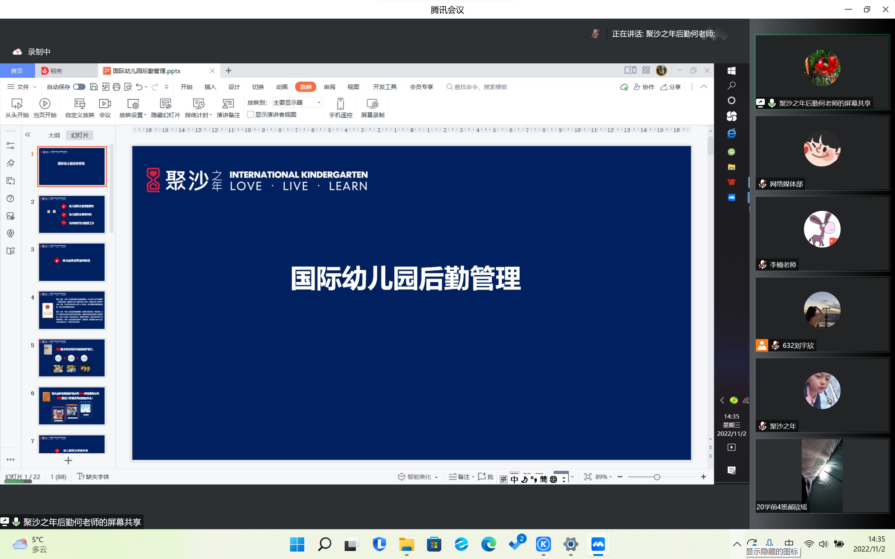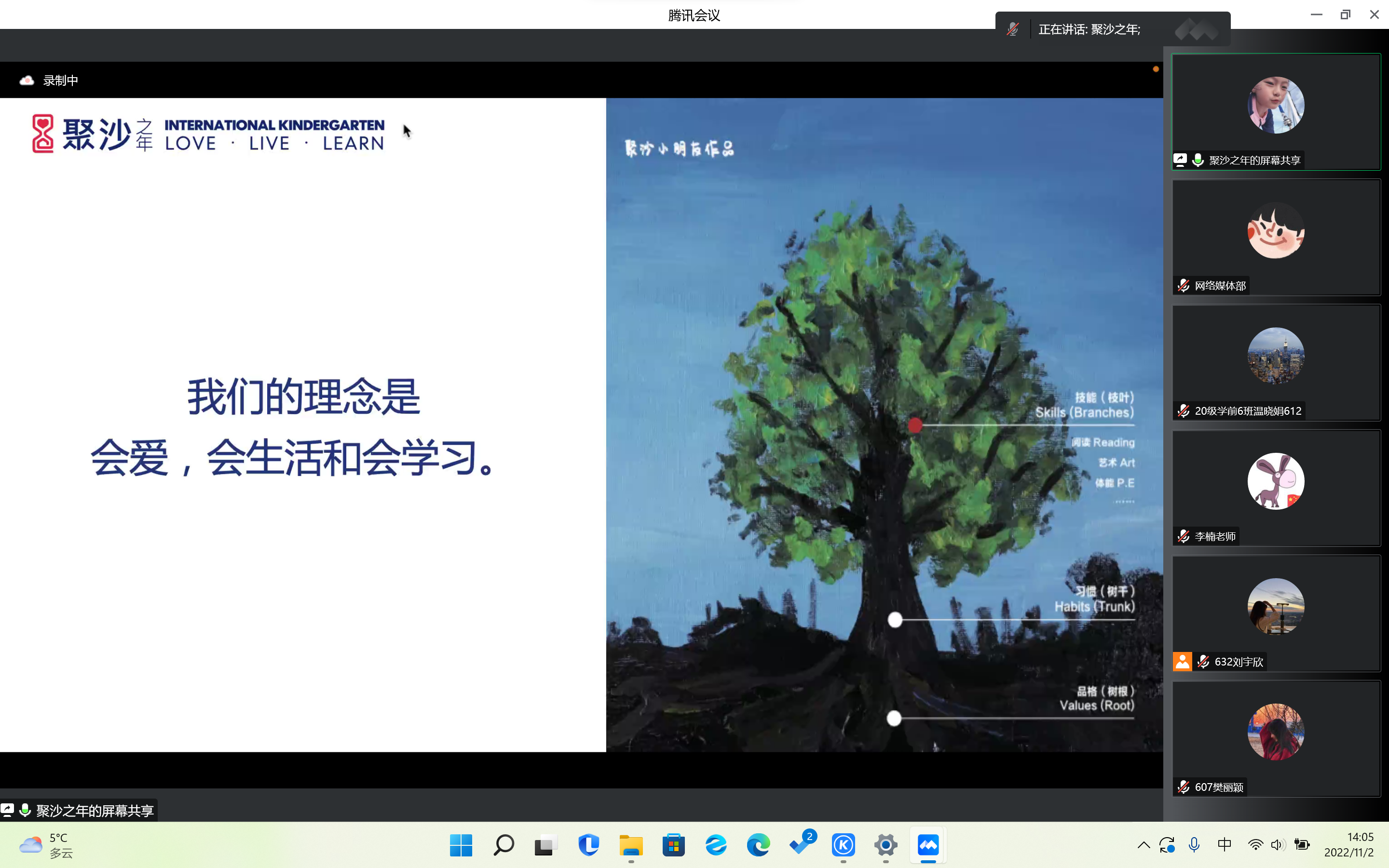 为了让学生明确实习方向,积累一定的教学经验,提升学前专业学生的专业素养,为将来的实习与工作做好准备,学前与小学教育学院于2022年11月2日在腾讯会议举办博言讲堂之“国际幼儿园的教学理念和教学特色以及后勤管理工作”讲座。本次讲座由聚沙之年国际幼儿园教研总监兼业务园长霍丝洋老师和后勤园长何慧贤老师主讲,出席本次讲座的人员有专业课教师李楠老师及20级学前教育专业全体学生。