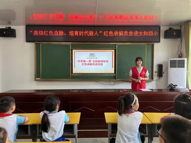 为积极引导广大青年坚定理想信念,将学前与小学教育学院党史学习教育落实到实践中,2022年9月2日,由吉林师范大学博达学院学前与小学教育学院学生孔文迪担任红色讲解员走进太和县第四小学,进行党史学习教育的宣讲。
