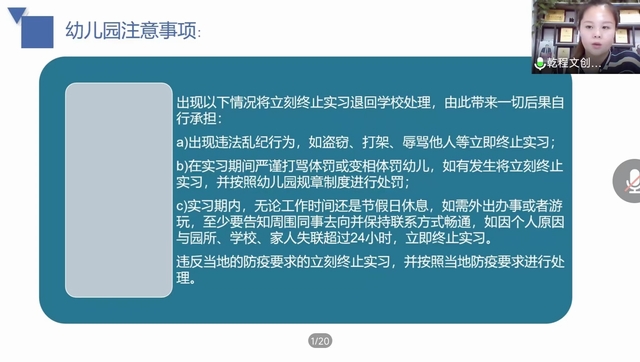 随后,陈娜老师从实习生入职须知方面讲解幼儿园工作的注意事项。老师指出:实习期间同学们要严格遵守学校规章制度,服从管理,听从安排,维护教学秩序,遵守教学纪律。同时,老师提倡同学们在实习期间端正学习态度,虚心向工作人员学习,妥善处理好学习与工作的关系,不断提高综合素质,磨炼教师技能,打好实习基础,积累更多的教学经验。