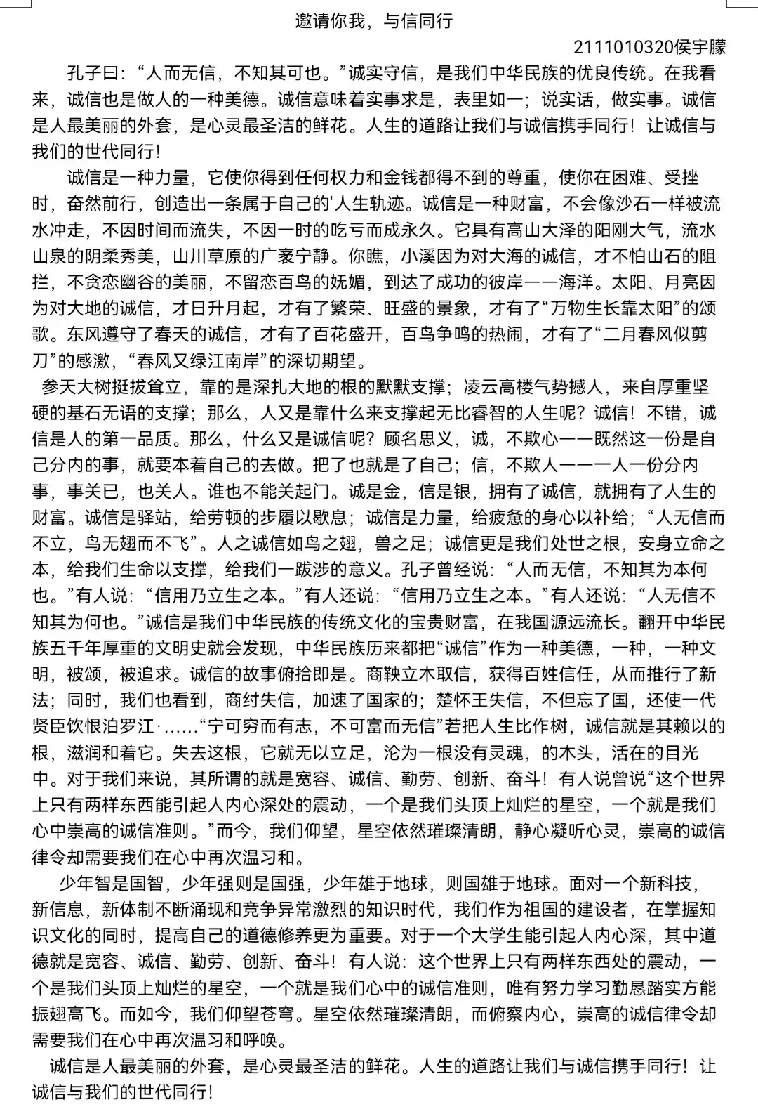 诚信,是为人之道,是立身之本,为鼓励学生进行积极的自我探索,提升诚信观念,营造健康和谐的校园文化氛围,增强学生的诚信和感恩意识,开展 “诚邀你我,与信同行”主题征文活动。
