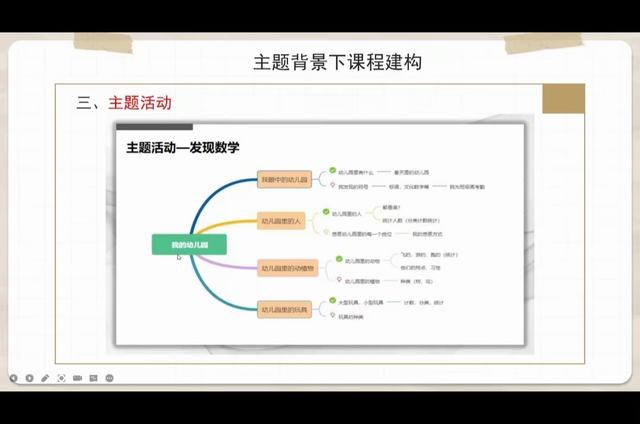 紧接着,何静老师对主题背景下课程建构进行了说明。课程的建构包括自主性区域活动,创新性户外活动,主题活动,益智区活动等方面,教师要有创造性,合理创设课程,寓教于乐,让孩子们爱上学习。