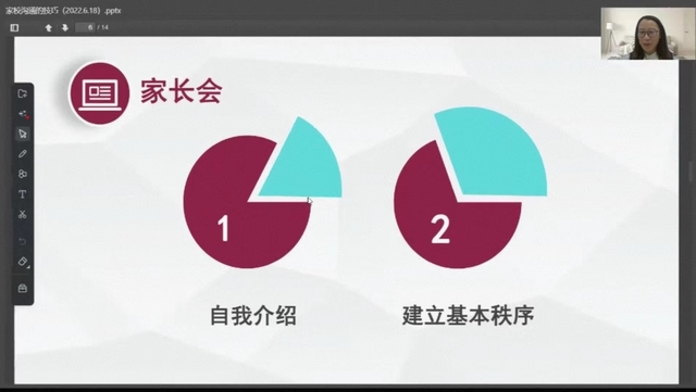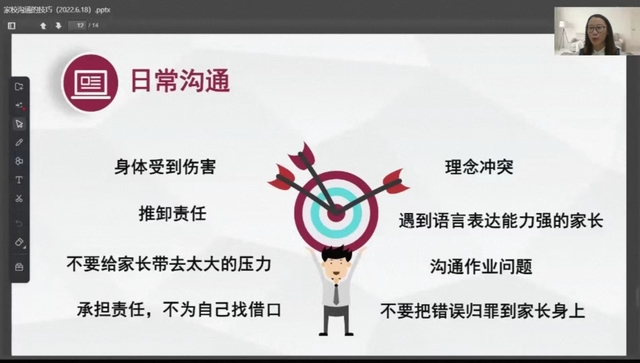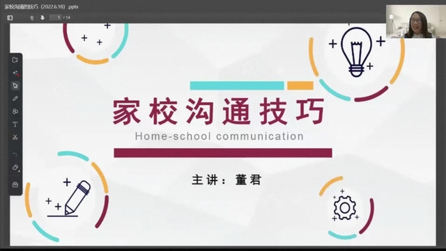 最后,董君老师从日常沟通方面进行讲解。教师在日常沟通中,要向家长传授正确的育儿知识来帮助家长解决问题,在发生问题时要做好理性的判断,耐心进行沟通。在班级中出现问题时,教师要结合实际来分析问题,提出解决的办法,在与学生沟通时,要把握言语分寸,避免言语不当。在家校沟通中,教师要虚心接受家长和同学的意见,与家长和同学更好地沟通。