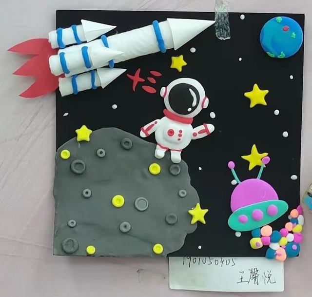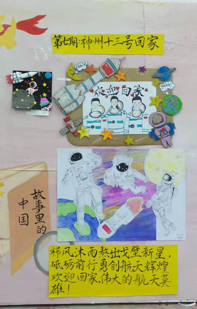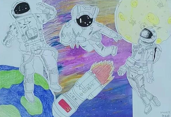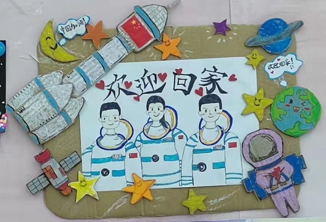 神舟十三号发射升空后,与天和核心舱对接形成组合体,3名宇航员进驻核心舱,进行了为期6个月的驻留,创造了中国航天员连续在轨飞行时长新纪录。下面这幅手工画是21级贺海漪同学创作的,她通过这份作品表达出对宇航员们的赞美之情。