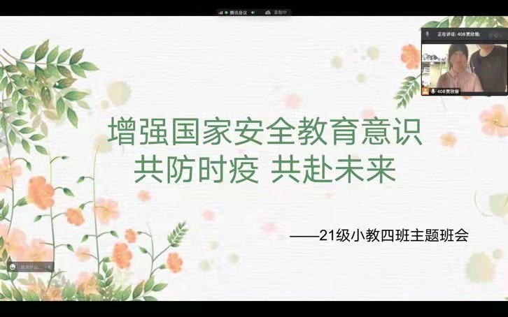 会议伊始,同学们进行开场表演节目《最美风景线》。然后,班长介绍国家安全教育日相关知识以及相关科普视频,让同学们学习有关国家安全教育日的知识。随后,班级一起进行游戏环节,科普防疫知识的同时增进了班级体的团结和凝聚力。最后,班长进行总结,希望小教四班大家庭能够一直团结友爱,一起静待花开,共赴未来!