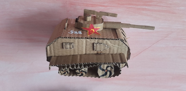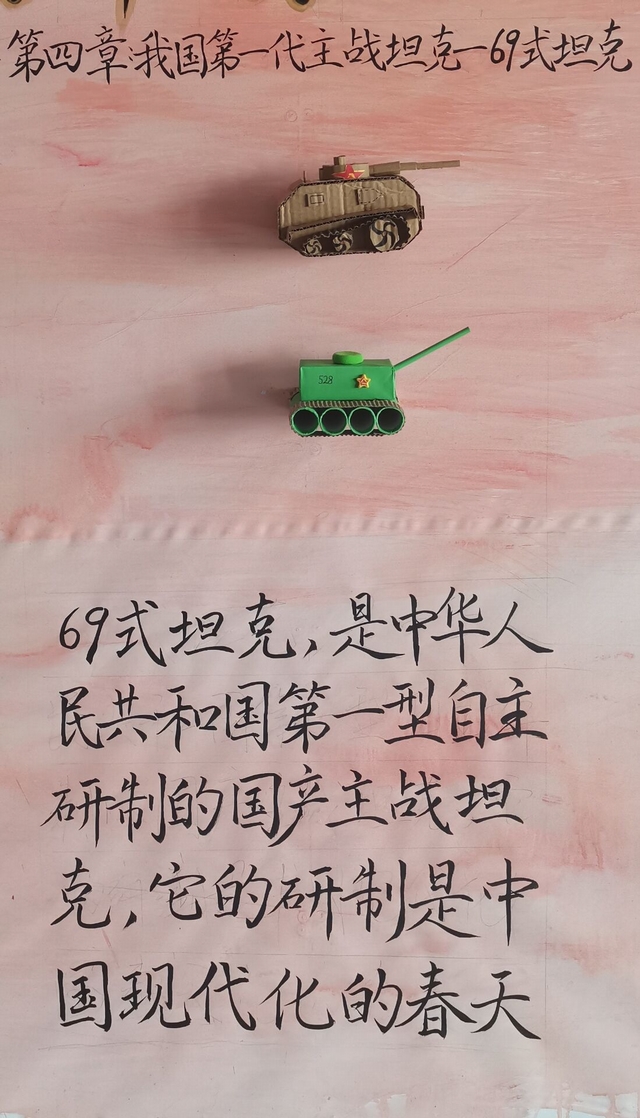 建国初期,我国将机械化装备建设放在重要位置。经过十余年的努力,在充分吸收和借鉴59式坦克技术的基础上,我国坦克科技人员自行设计、研制的国内第一代中型坦克,于1974年3月26日,由国家科技机构批准设计定型,并命名为“1969年式中型坦克”,简称69式中型坦克。下面这个作品是21级孔文迪同学创作的,运用精湛的技艺制作出坦克模型,表达出自己对坦克的喜爱之情。