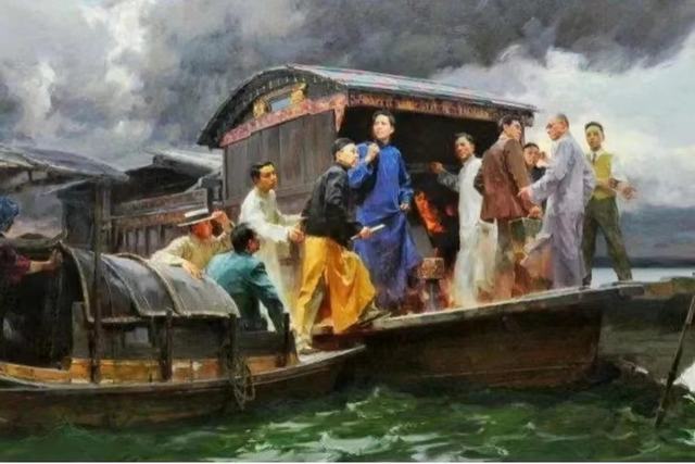 1921年7月中国共产党第一次全国代表大会因上海法租界巡捕的袭扰,被迫于8月初转移至浙江嘉兴南湖的一条游船上继续举行,代表们在游船上讨论通过了中国共产党的第一个纲领和第一个决议,选举了党的中央领导机构,宣告中国共产党成立。
