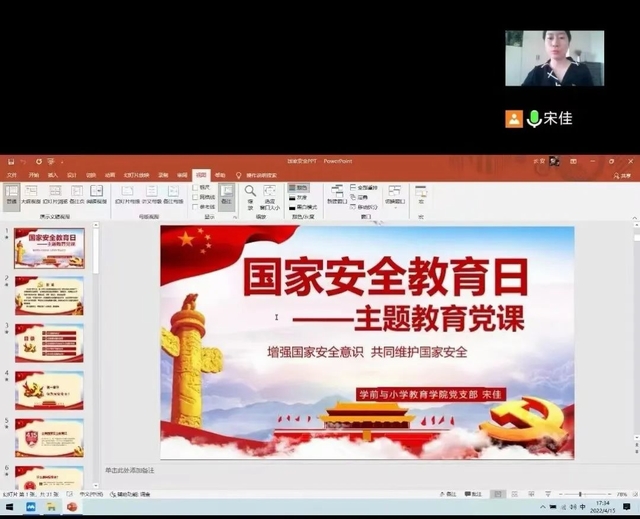为推动国家安全宣传教育工作深入开展,增强同学们的国家安全意识,将国家安全融入到学生的日常教育工作中,激发同学们的爱国热情,学前与小学教育学院学生党支部于2022年4月15日在腾讯会议开展国家安全教育日主题党课。本次党课由学生党支部书记宋佳同志主讲,党务学生干部和积极分子代表参与学习。
