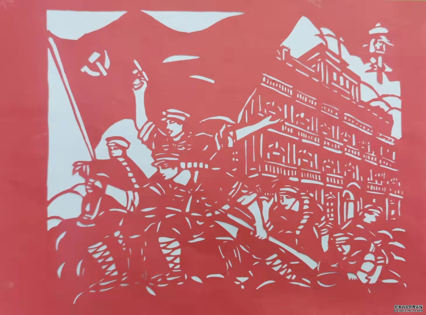 上面的剪纸作品是21级管子钰同学的,其作品是中国共产党人与党旗的合照,表达了中国共产党克服了艰难险阻,不懈奋斗的故事。中国共产党的诞生不易,今天的美好生活更是来之不易。同学们,我们要珍惜当下的幸福时光,努力奋斗,开创更美好的未来!