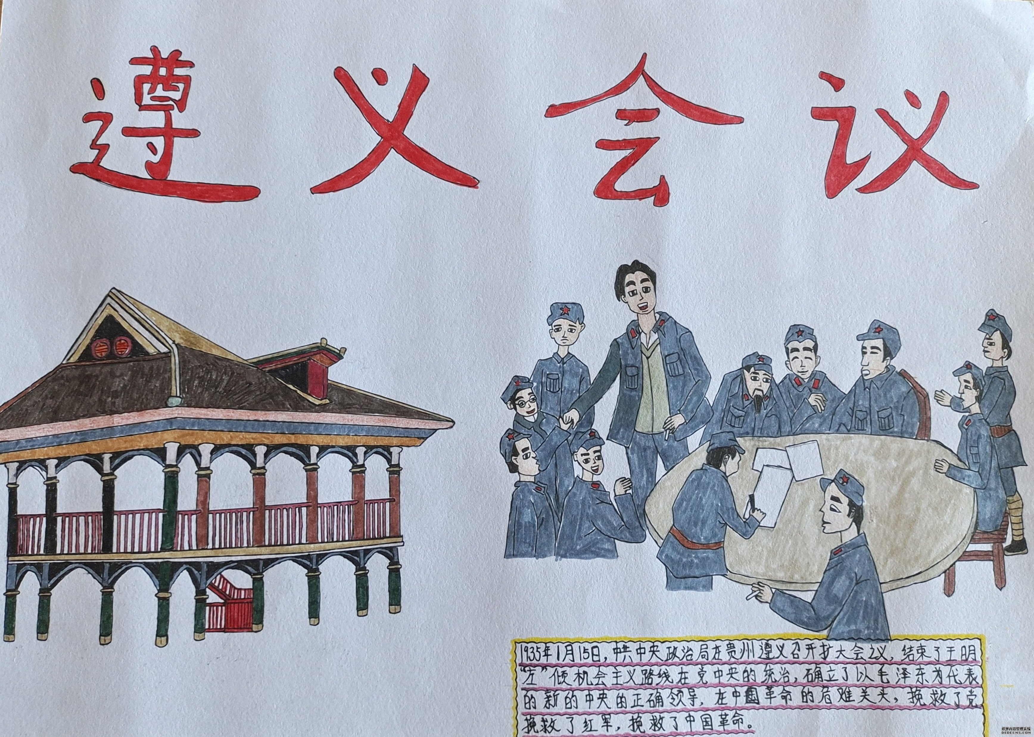 会议的主要议题是总结第五次反“围剿”以来的经验教训。根据绝大多数同志的意见和要求,改组了中央书记处和中央革命军事委员会,毛泽东被选为政治局常委,取消了博古和李德的最高军事指挥权。推选张闻天代替博古在中央负总责,毛泽东、周恩来负责军事。随后,又成立了以毛泽东为首,周恩来、王稼祥参加的三人军事指挥小组。从此结束了王明“左”倾冒险主义在党中央的统治,确立了毛泽东在红军和党中央的领导地位。遵义会议是中国共产党第一次独立自主地运用马克思列宁主义基本原理解决自己的路线、方针和政策方面问题的会议,使红军和党中央在极其危急的情况下得以保存下来。从此以后,红军转败为胜,转危为安,胜利地完成了二万五千里长征。遵义会议是中国共产党和中国工农红军历史上一个伟大的转折点。上面的绘画作品是21级史欣悦同学的,绘画作品表现出了遵义会议过程中的艰辛,也表现出了遵义会议的召开对共产党未来的发展是有着重要意义的。