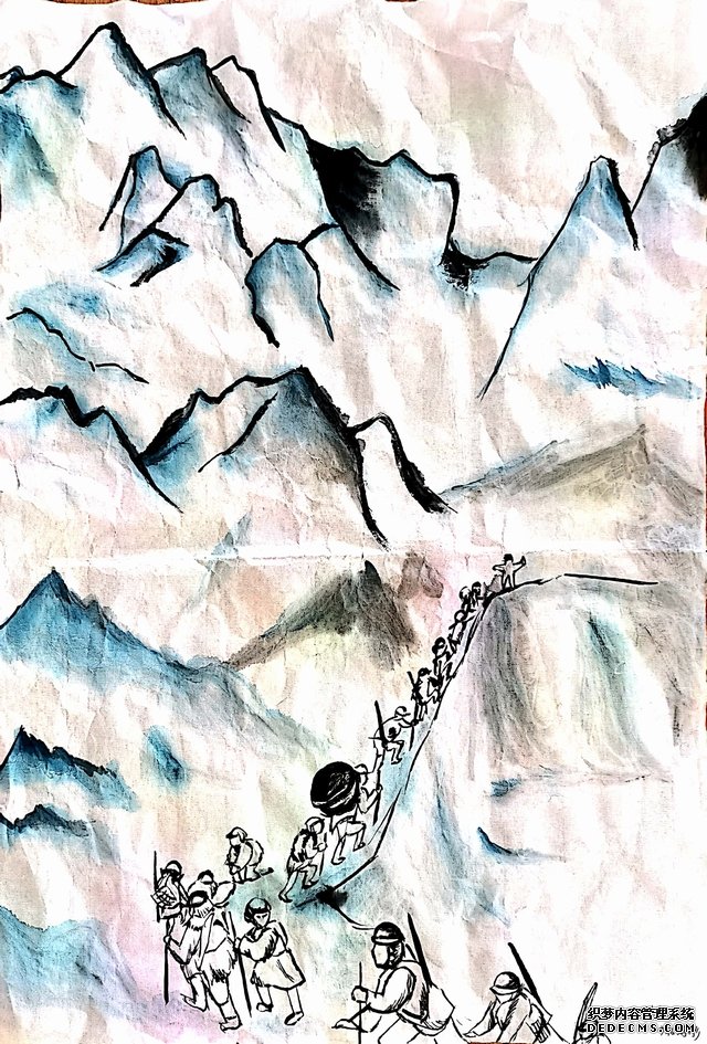 1935年1月,党中央在遵义召开政治局扩大会议。在新的中央领导的指挥下,中央红军重整旗鼓,四渡赤水河,巧渡金沙江,翻雪山,摆脱了国民党军队的围追堵截,取得了战略转移中具有决定意义的胜利。上面这幅水墨画作品是21级桃明彤同学的,其作品主要是中国红军翻越雪山的画面。为我们传达了红军长征过程的的艰难险阻,同时也可以看出红军们严守纪律,坚定信念,紧密团结的精神。